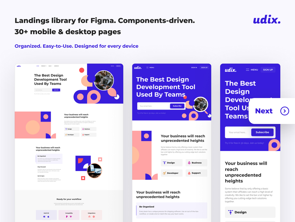 uDix is a landing page and marketing website UI Kit created for busy freelancers, product owners, and designers. The product was created based on our 5+ years of experience working on marketing websites and landing pages project. Made of components & instances. Crafted with attention to naming and constraints.